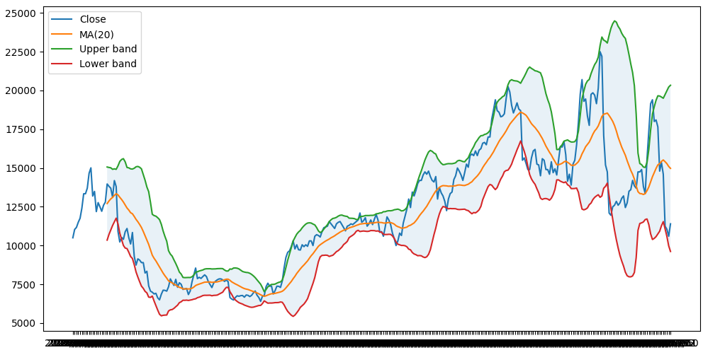 즉, 상한선은 이동평균 + 2표준편차, 하한선은 이동평균 - 2 표준편차로 계산됩니다.