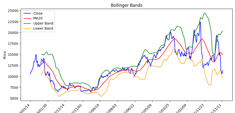 ax.plot(df['Date'], lower_band, color='orange', label='Lower Band')