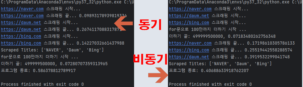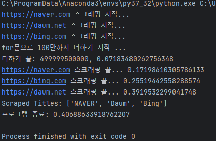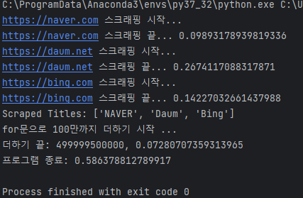 어떤가요? 호출은 정상적으로 웹스크래핑 함수를 호출하였고 그 뒤에 연산 함수까지 호출이 되었으나 웹 스크래핑 결과를 기다리지 않고 호출만 된 상태이며 각각의 웹 스크래핑 결과는 리턴되는 시점에 맞춰서 각자 알아서 끝나게 됩니다.