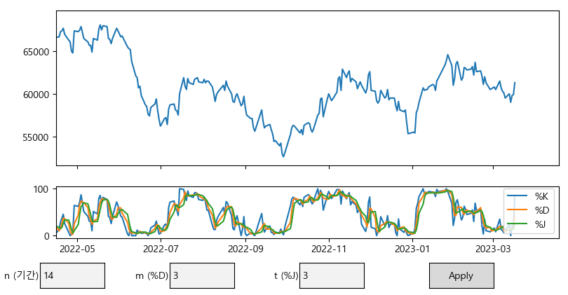 기존에 사용하던 HTS와 같이 손쉽게 수치를 바꾸면서 원하는 값을 찾을 수 있도록 사용자가 매개변수 값을 입력할 수 있게 해 두었습니다. 원하시는 기간을 입력하신 후 버튼을 클릭하면 하단의 스토캐스틱 차트에 값이 반영이 되도록 되어 있습니다.