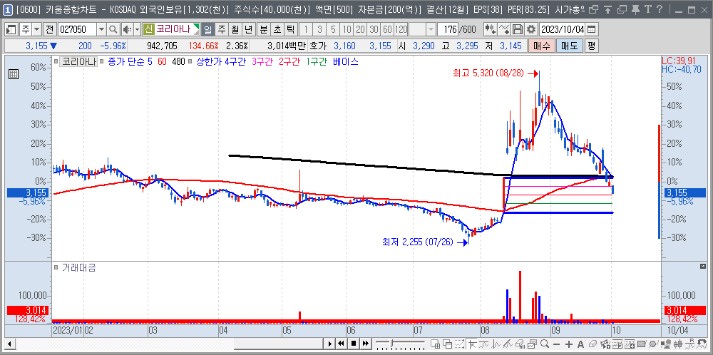 안녕하세요. 주식 관련 투자 지식을 공유하는 투자자 인천고래입니다. 오늘은 이전글에 이어서 상한가 캔들 혹은 기준봉의 저점과 고점을 대상으로 4등분 선을 그려보도록 하겠습니다. 2023.08.29