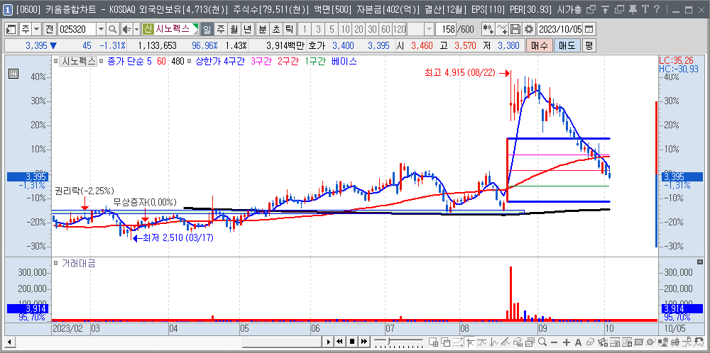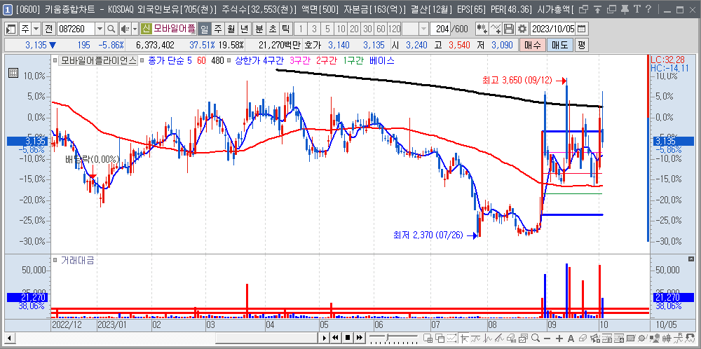 | 2023-08-23 | 056360 | 코위버 | 5,830 | 1/4 | 애플카,양자 암호 |