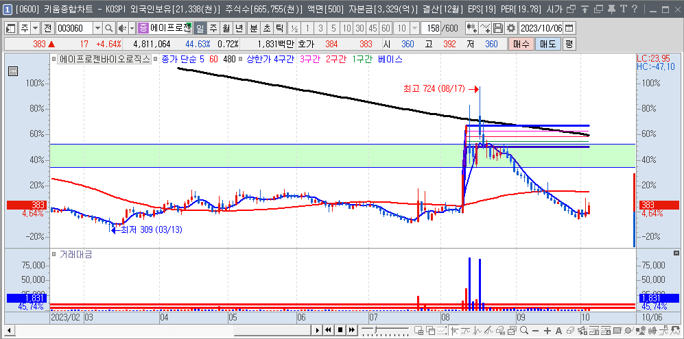 | 2023-08-09 | 003060 | 에이프로젠바이오로직스 | 363 | 1/4 | 에이프로젠 그룹,제약 & 바이오 #4 |