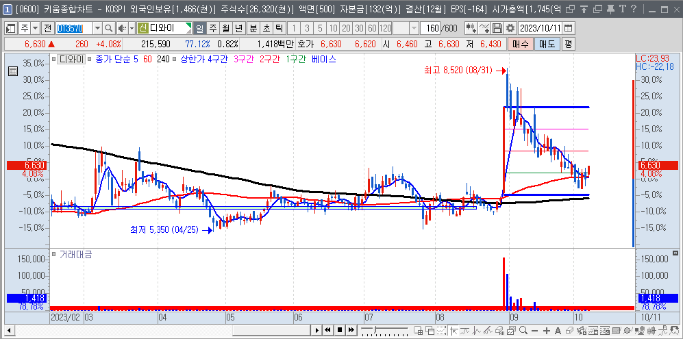| 2023-08-30 | 013570 | 디와이 | 6,485 | 2/4 | 자율 주행 #1,로봇 #2,수소 (전지) #2 |